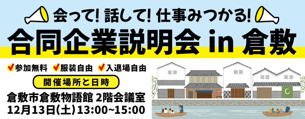 岡山県内で、岡山市や倉敷市、津山市などで開催される合説や、企業説明会の情報を掲載しています。