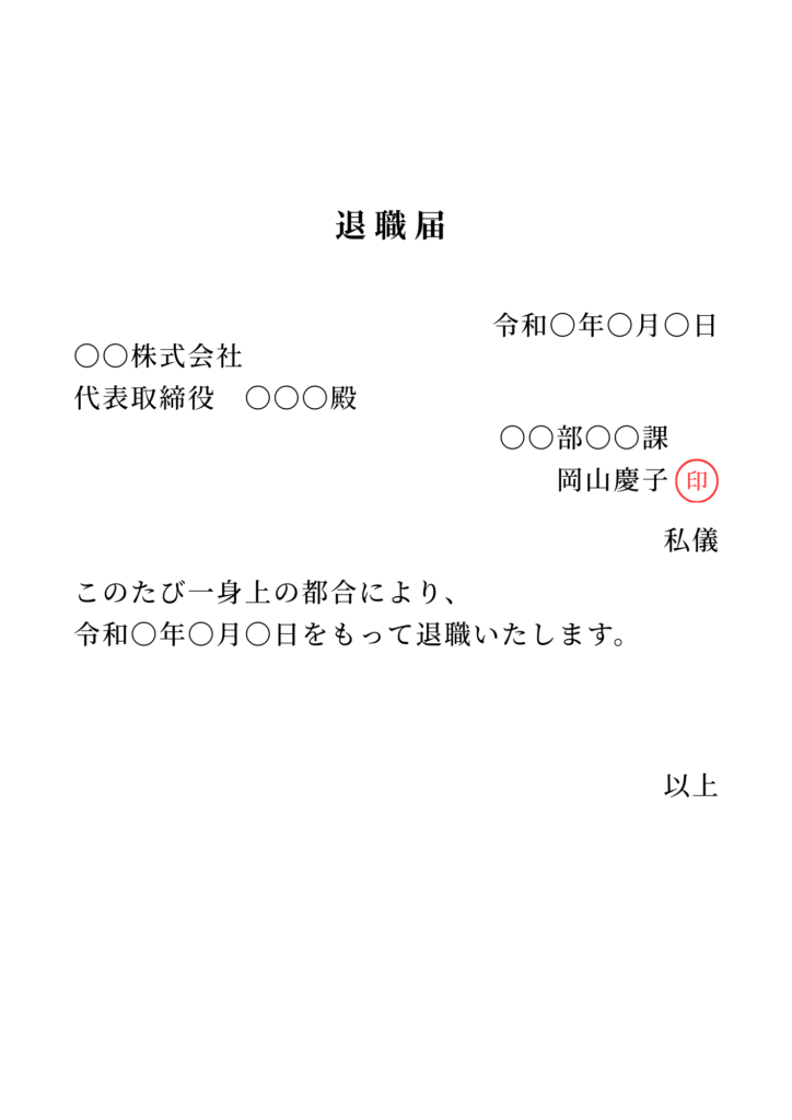 | 8.文末 | 退職願の場合は「退職いたしたく、お願い申し上げます」、退職届の場合は「退職いたします」と結びます。 本文の後に、右詰めで「以上」と記載して締めくくります。 |