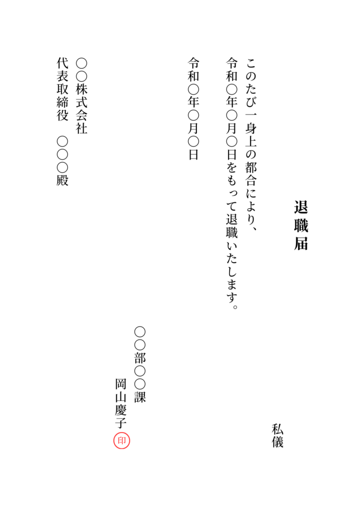 | 5.文末 | 退職願なら「退職いたしたく、お願い申し上げます」、退職届なら「退職いたします」と結びます。 |