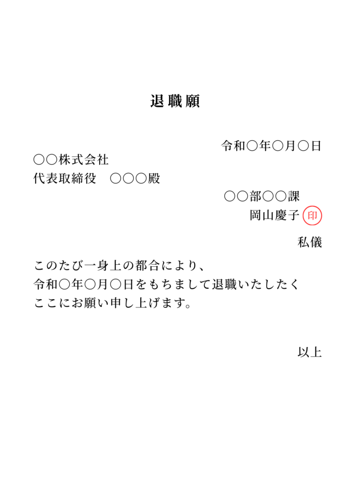 | 表面 | 中央に「退職願」または「退職届」と記載します。文字は黒のボールペンまたは万年筆で丁寧に書きましょう。 |
